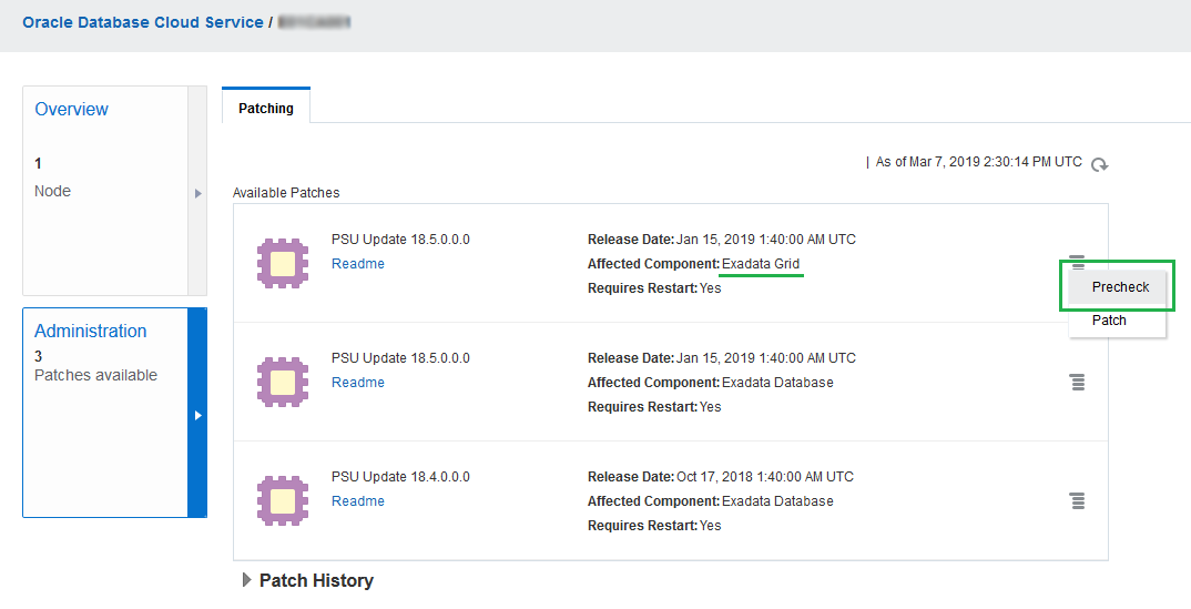 I am now exploring the brand new Grid Infrastructure patching method for Exadata Cloud at Customer. With Exadata Cloud at Customer version 18.1.4.4, it is now possible to patch Grid Infrastructure with a few clicks in the GUI. Let’s see exactly which steps are performed.